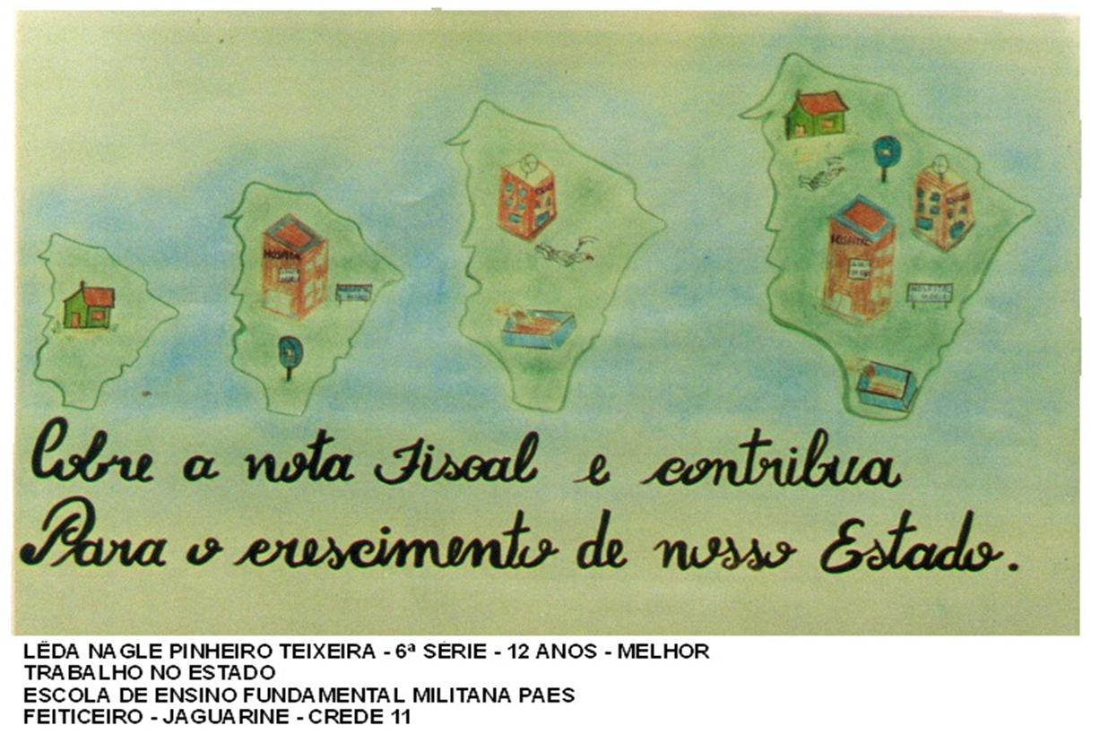 Também em 1999, aconteceu o concurso “Tributos em Cartaz”, que tinha como objetivo a confecção de um desenho produzido pelos alunos do telensino de 5ª a 8ª série. Os alunos tinham que produzir um cartaz que tivesse como tema a importância do ICMS para o Estado e a necessidade de exigir a nota fiscal. A ganhadora do concurso foi a aluna Lêda Nagle Pinheiro Teixeira de 12 anos, da 6ª série da Escola de Ensino Fundamental Militana Paes, na Cidade de Jaguaribe.